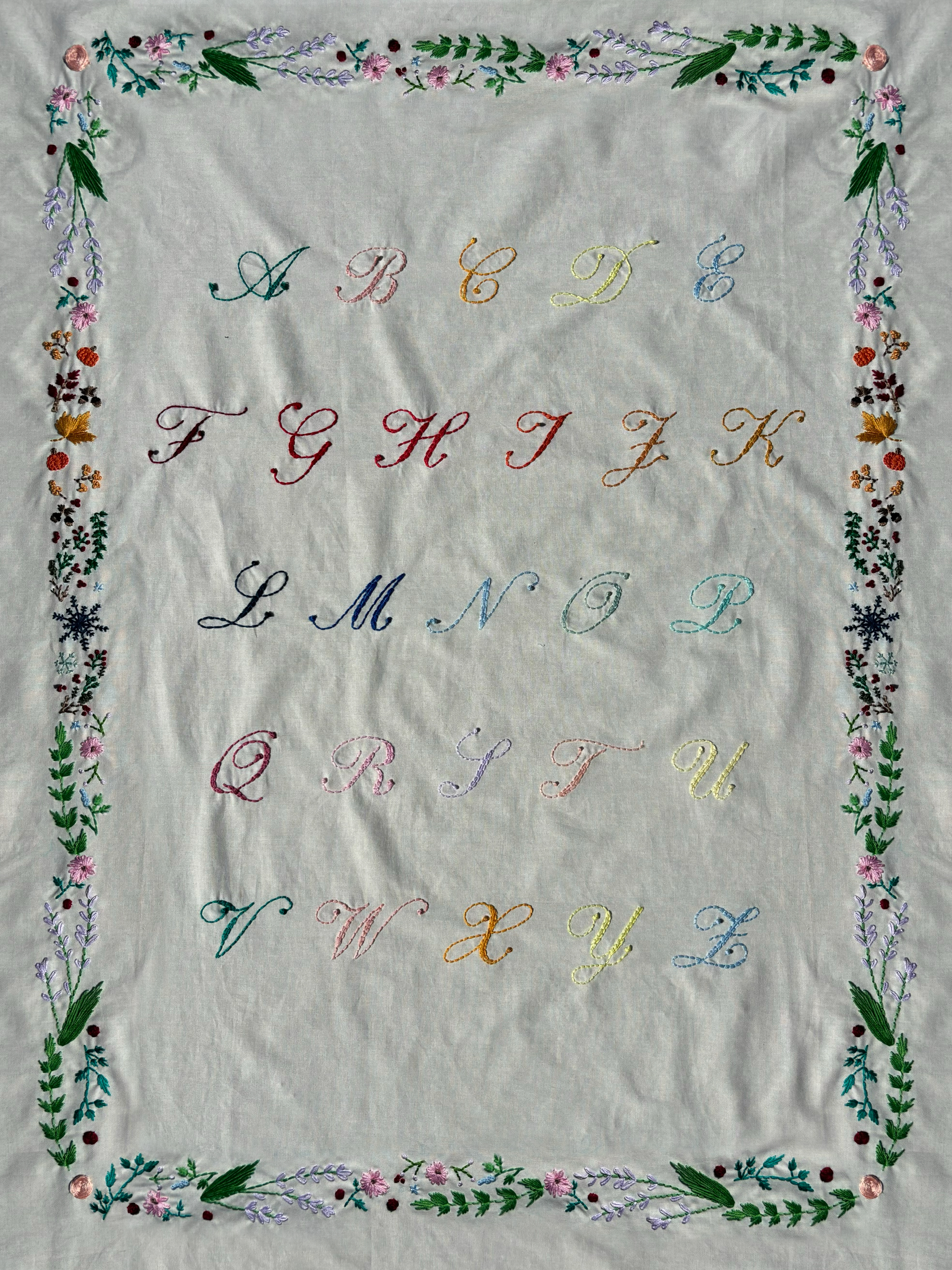 The alphabet was created with a hand-stitch technique, for both the letters and border. The alphabet showcases the seasons throughout the school year. Starting school in the summer then going through autumn, winter, and spring, and finally ending the semester in the summer.
